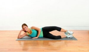- पैडेड मैट पर लेट जाएं। अपनी दाईं ओर झुकें और घुटनों को मोड़कर रखें।