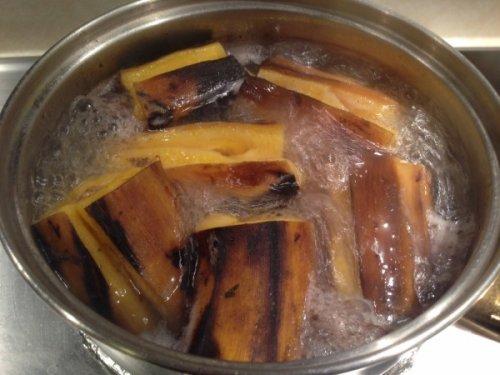 - पानी को उबालें। जब तक पानी उबल रहा हो केले को छीले बिना कई टुकड़ों में काट लें।